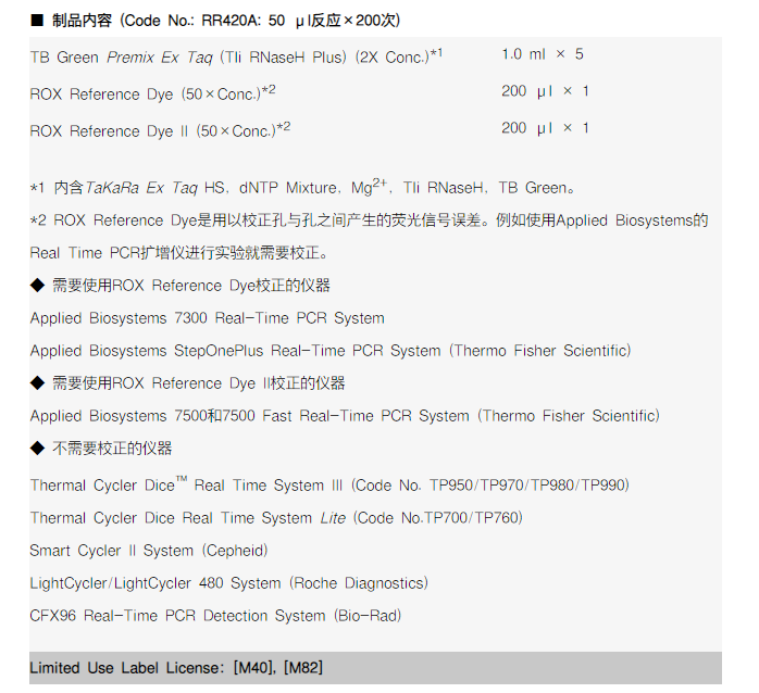 本制品是采用TB Green嵌合荧光法进行Real Time PCR的专用试剂。制品中含有Real Time PCR反应的最适浓度TB Green,是一种2X